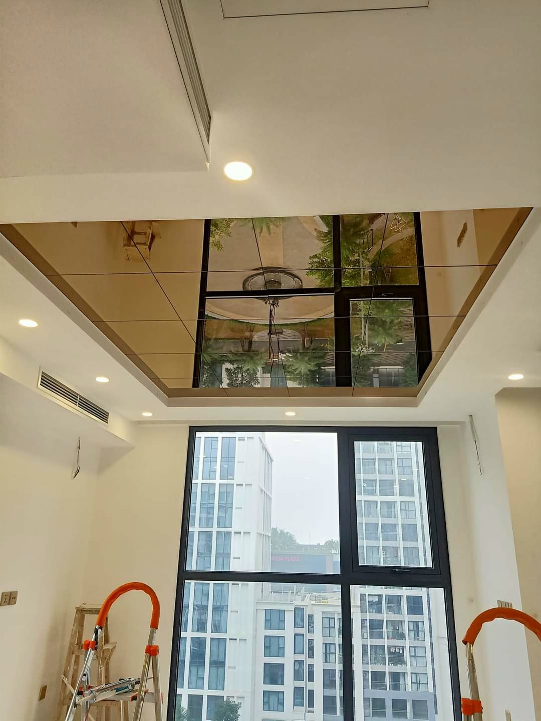 Thi công gương dán trần nghệ thuật tạo hiệu ứng ánh sáng độc đáo.