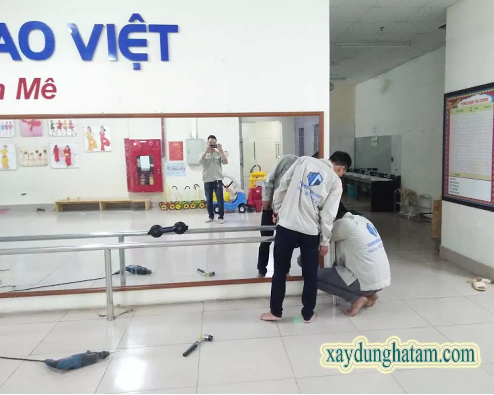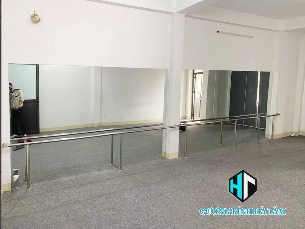 Hình ảnh gương phòng tập múa có gióng inox do Hà Tâm thiết kế thi công.