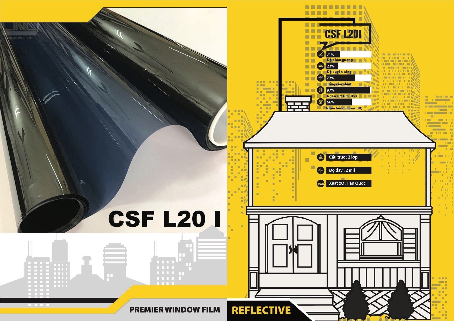 Phim sử dụng công nghệ tráng phủ kim loại (reflective) . Công nghệ này sẽ phủ một lớp ion kim loại siêu mỏng lên các lớp phim. Các ion kim loại có khả năng phản xạ lại ánh nắng mặt trời mà không hấp thụ nhiệt, do đó khả năng cách nhiệt của các sản phẩm phim cách nhiệt tráng phủ kim loại là rất tuyệt vời thường được các văn phòng , tòa nhà sử dụng nhiều.