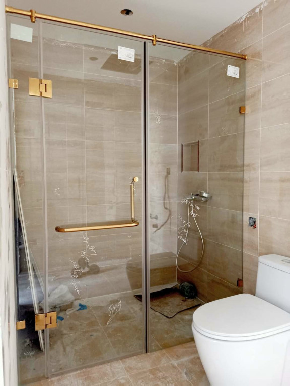 Thi công cửa kính cường lực +cabin kính phụ kiện inox màu vàng PVD cao cấp