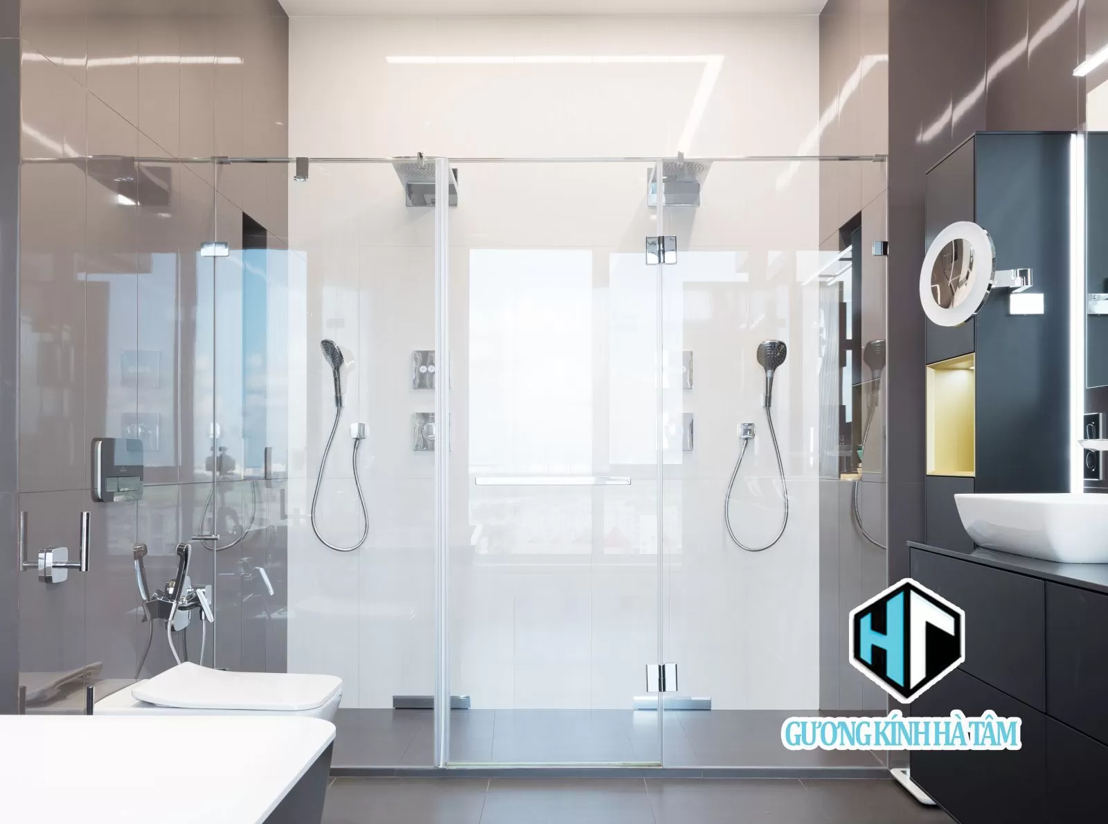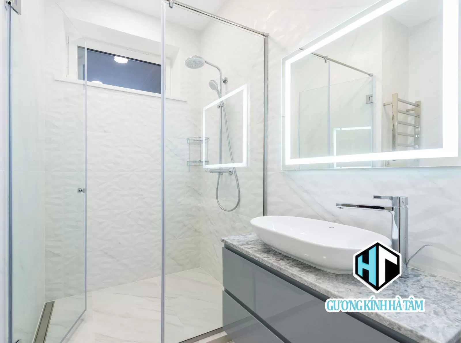 Cửa kính cabin 2 tấm+ gương led do Hà Tâm Glass thi công