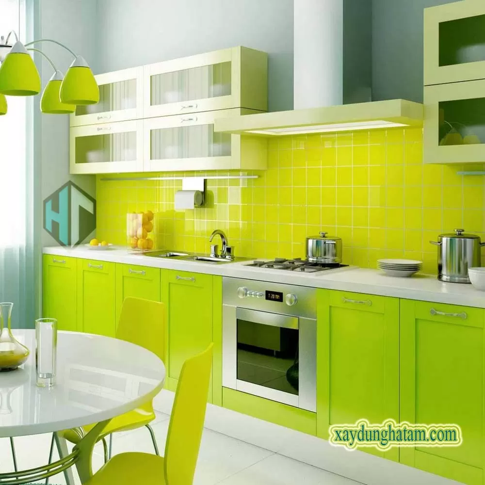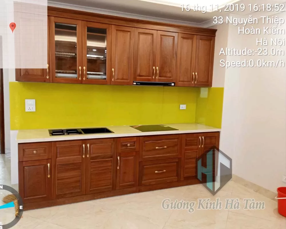 Kính ốp bếp sơn màu vàng chanh- nhận sơn màu theo yêu cầu
