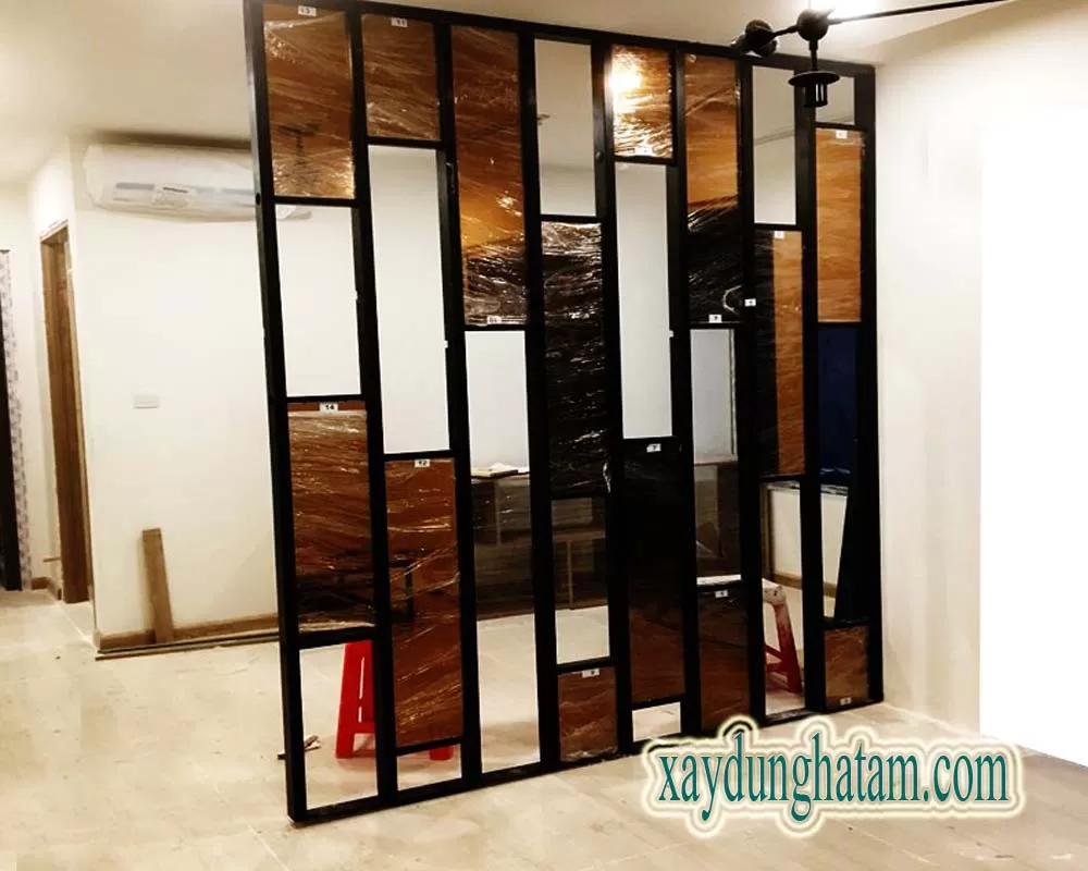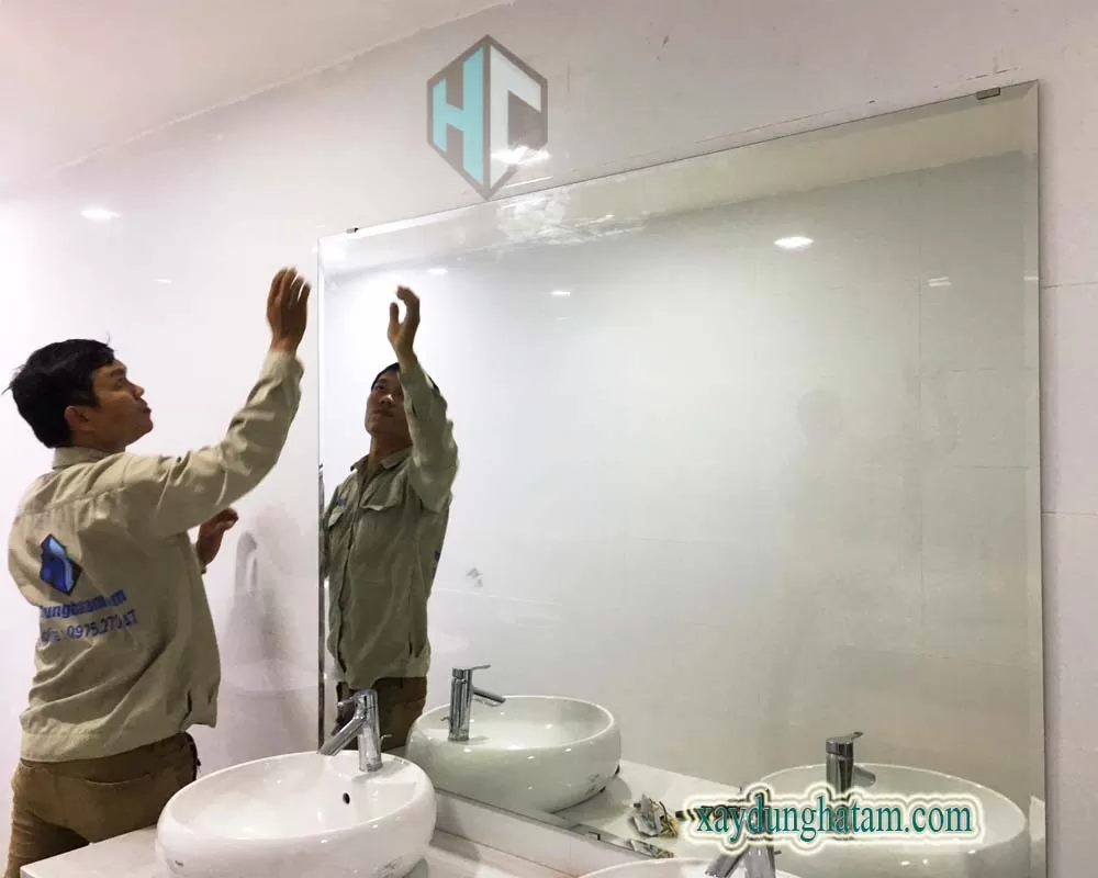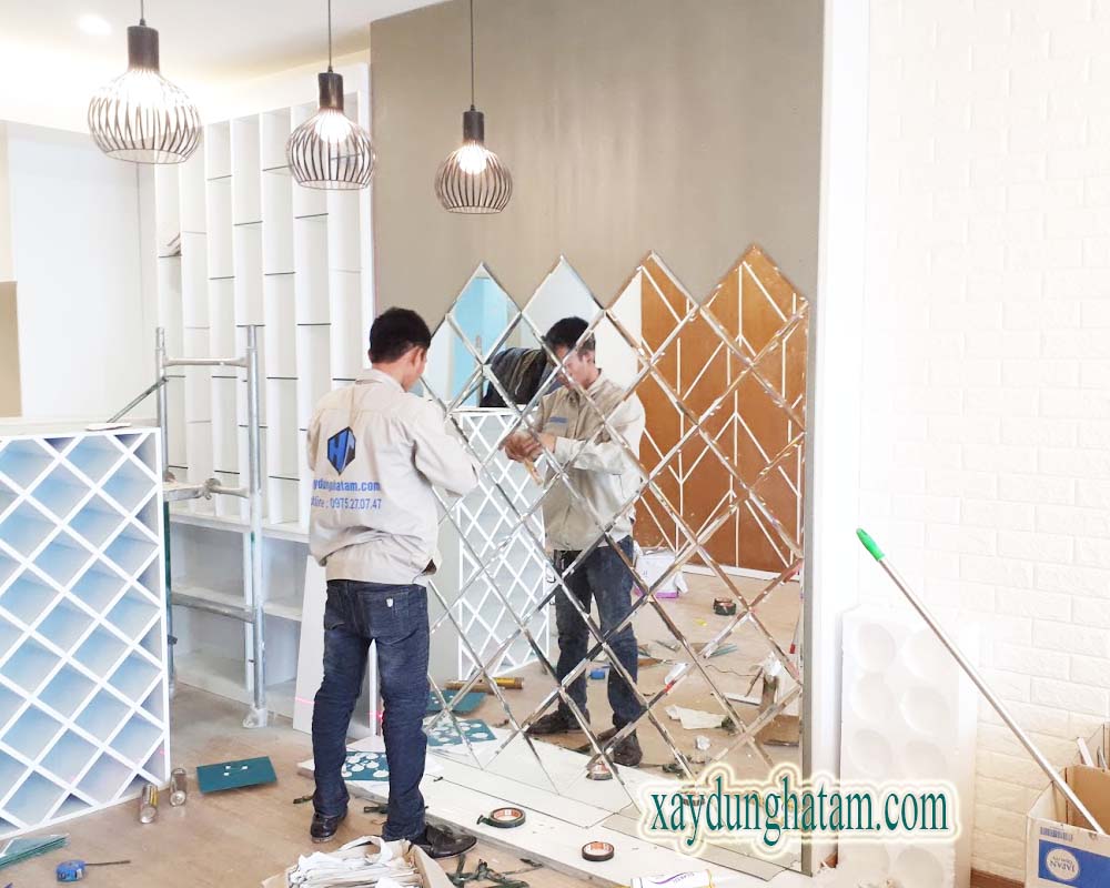 Hình ảnh thợ Hà Tâm lắp gương trang trí, gương dán tường, gương phòng khách.