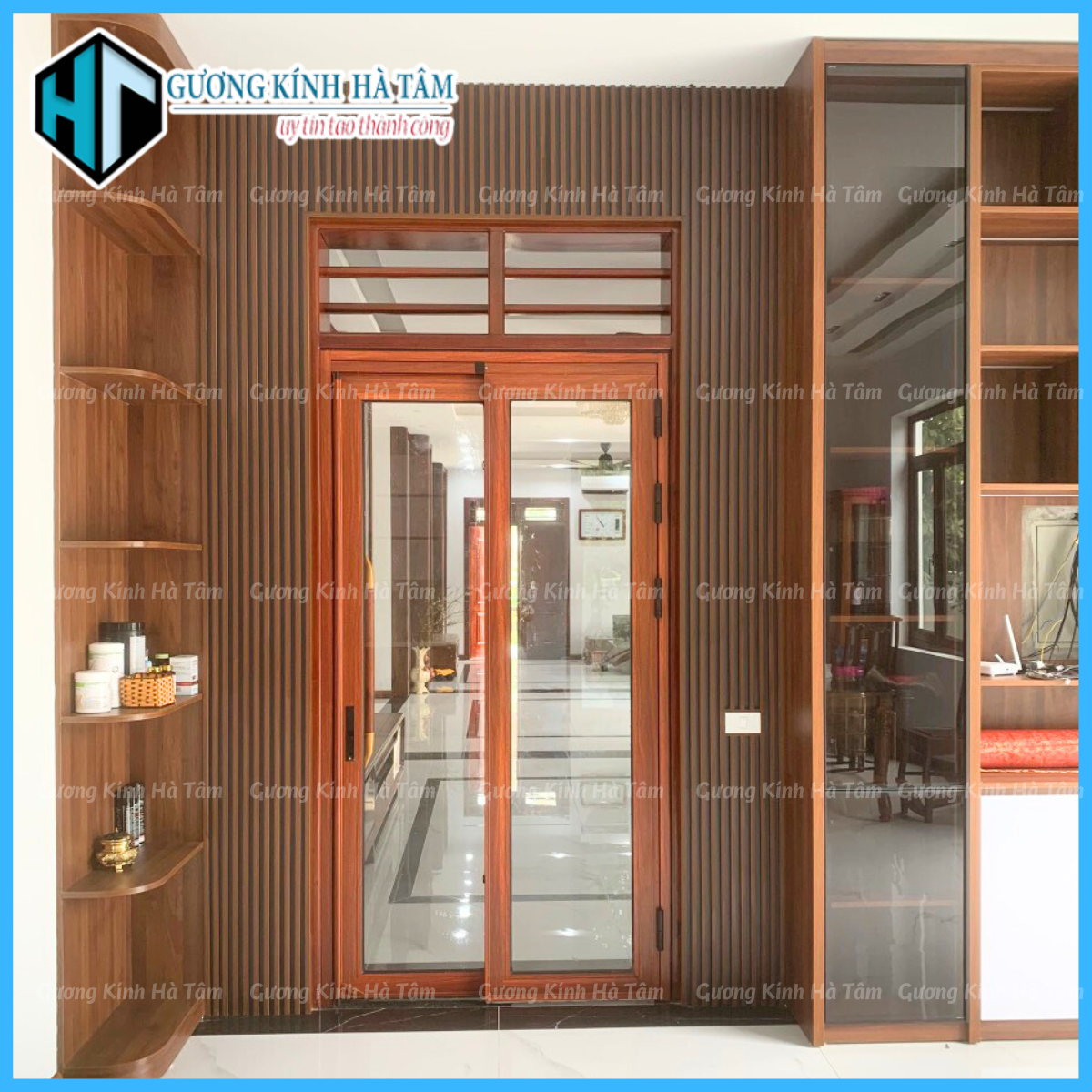 Hệ cửa nhôm trượt quay với cấu trúc kính hộp cách âm cùng nan trang trí