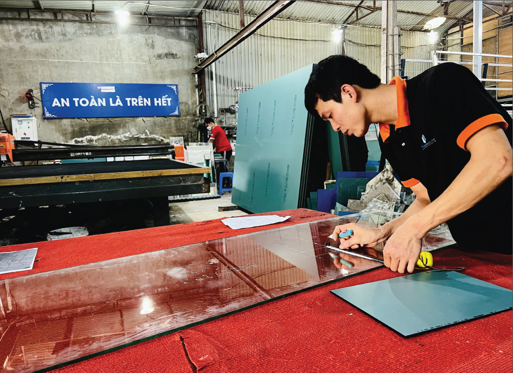 Đôi ngũ nhân viên Xưởng Hà Tâm cắt mài gương kính - mang cả đam mê và tâm huyết vào từng sản phẩm.
