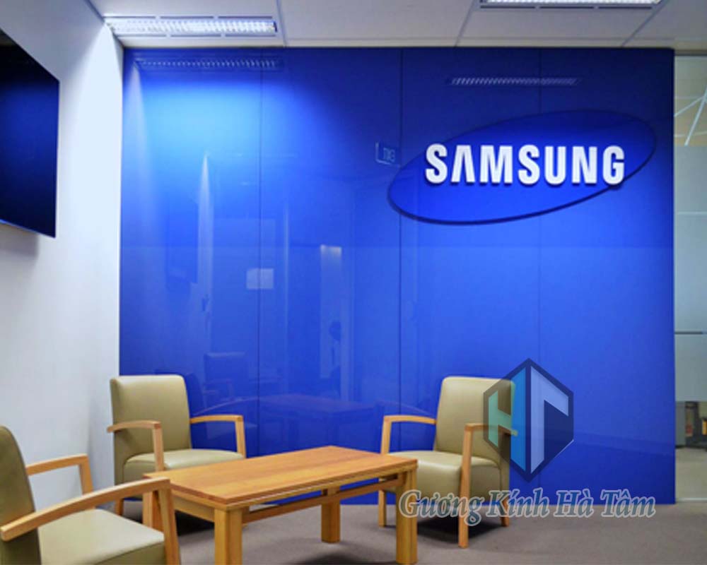 Hình ảnh vách kính sơn màu xanh tại 1 văn phòng nhà máy Samsung do Hà Tâm thiết kế thi công.